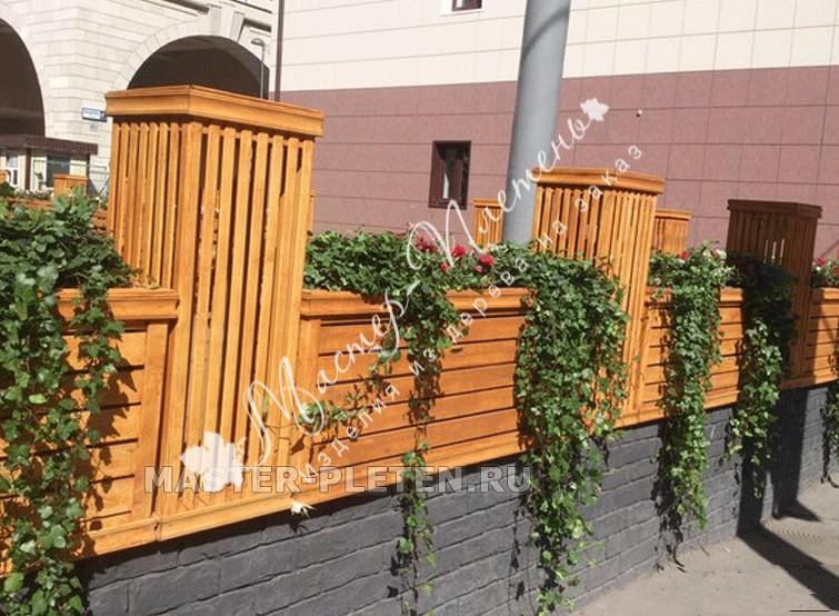 На фото представлено интересное решение для ресторана - обрамление территории деревянными кашпо с колоннами, собранными в единую композицию. Действительно, дерево сочетается с натуральными цветами как ничто лучше. Конструкция из дерева представляет собой кашпо под цветы, выполненное из горизонтально поставленных досок, а импровизированные колонны выполнены из вертикальных досок с одинаковыми зазорами. Таким образом, получалась легкое на вид изделие, которое полностью обрамляет территорию и заметно ее преображает.