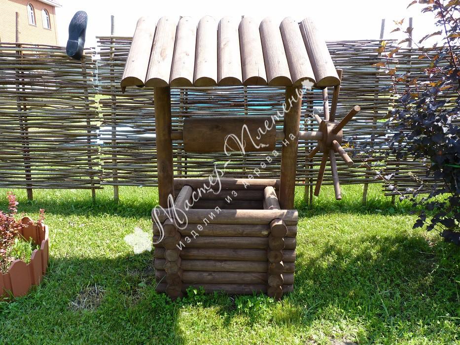 Небольшой декоративный колодец используется для украшения и облагораживания загородного участка. Наш колодец выполнен из бревен и имеет все элементы, присущие настоящему рабочему колодцу. По своей высоте он не высок, но при желании в нашей мастерской можно изготовить модель колодца по другим размерам.