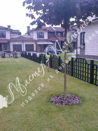 Невысокое ограждение загородного участка, как на фото, было сделано по эскизу нашего заказчика. Забор полностью сделан из дерева - клееного бруса сосны. Фигурный заборчик идет как бы волнообразно, что было задумано специально. Для оформления волны брус укладывался трапецией. В целом, как можно увидеть, забор продуман до мелочей и каждая деталь отвечает понятию эстетики и привлекательности.