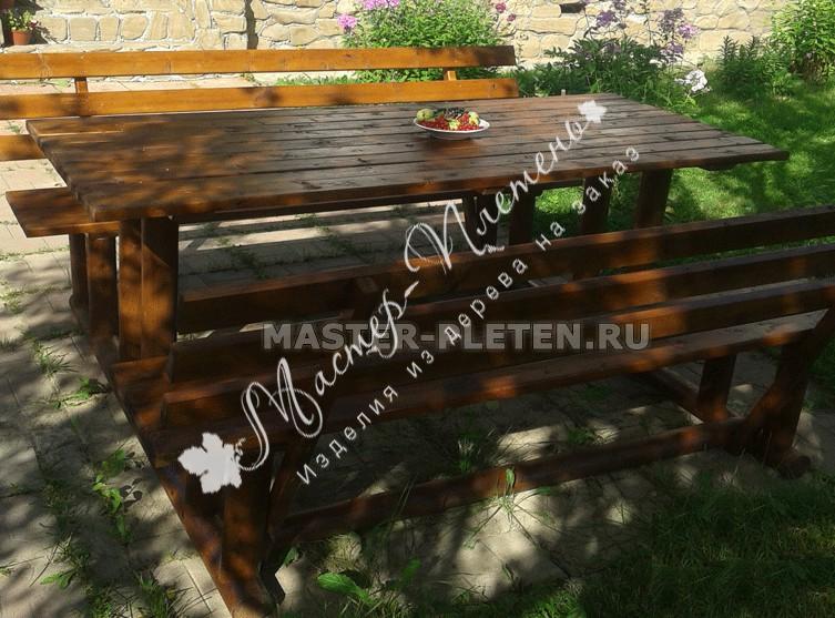Удлиненный деревянный садовый стол с лавочками