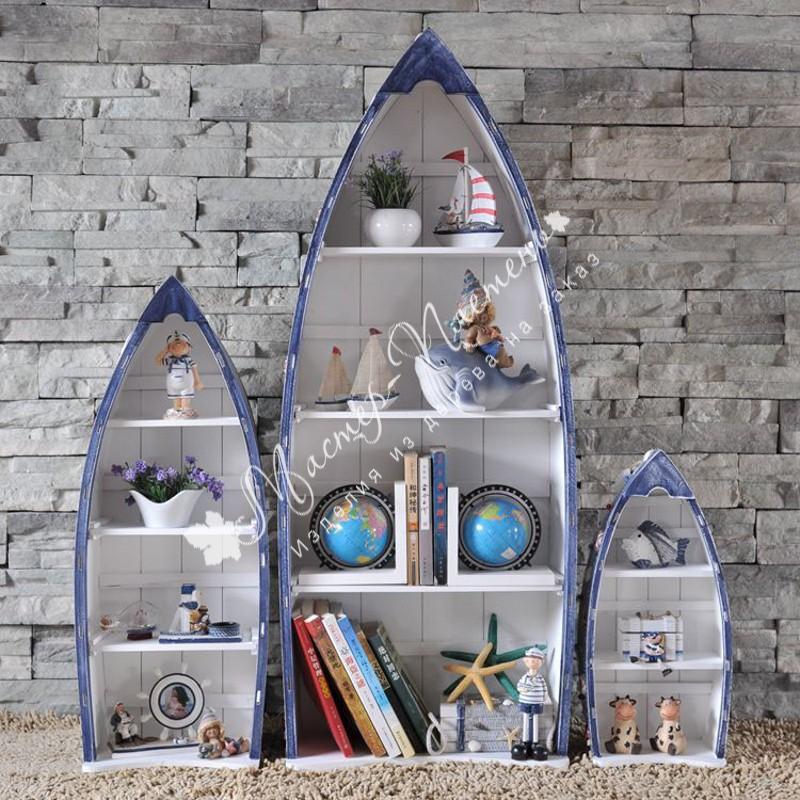 Морскую тематику в комнате поможет создать мебель в виде декоративных деревянных лодок. Лодка стеллаж – оригинальный вид мебели, состоящий из полочек одного или разных размеров. Лодка стеллаж используется для хранения предметов разного назначения: книг, игрушек, сувениров. Так же на полочках можно разместить корзинки либо контейнеры наполнив их предметами или вещами.