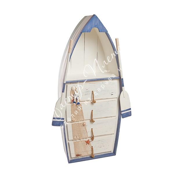 Декоративная лодка с выдвижными ящиками представляет собой полуоткрытый шкаф. В такой конструкции объединены открытые и закрытые элементы, которые предоставляют возможность хранения различных вещей от документов до одежды.