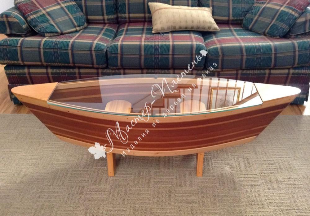 Прекрасная декоративная лодка стол из дерева подойдет любителям интересных предметов мебели в интерьере. Сквозь прозрачную столешницу, выполненную из стекла, видно дно лодки.