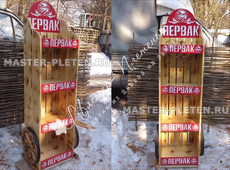 Торговая марка Первак - наш постоянный клиент, для которого в разные периоды существования компании изготавливались разные промо-изделия. В январе 2015 года поступил заказ на изготовление промо-стоек из дерева с декоративными колесами по бокам. Дерево было искусственно состарено. На каждую полочку и каркас изделия нанесен логотип ТП Первак. В наших силах изготовить любую деревянную промостойку по эскизам и пожеланиям клиента. На оптовые заказы ощутимые скидки!