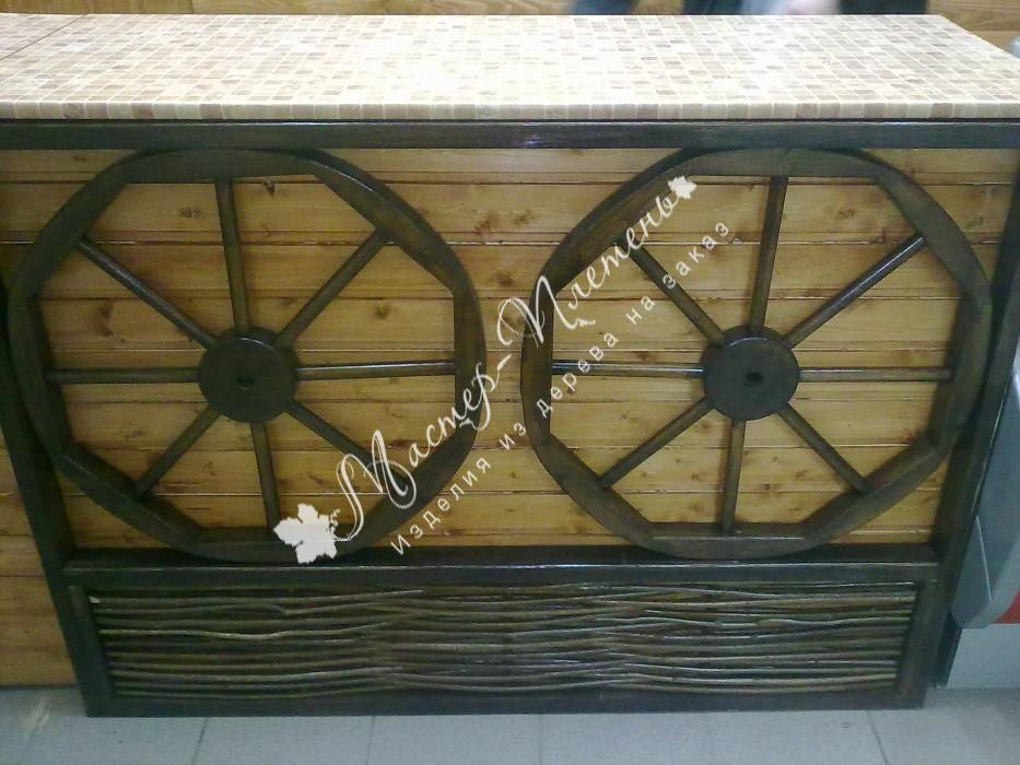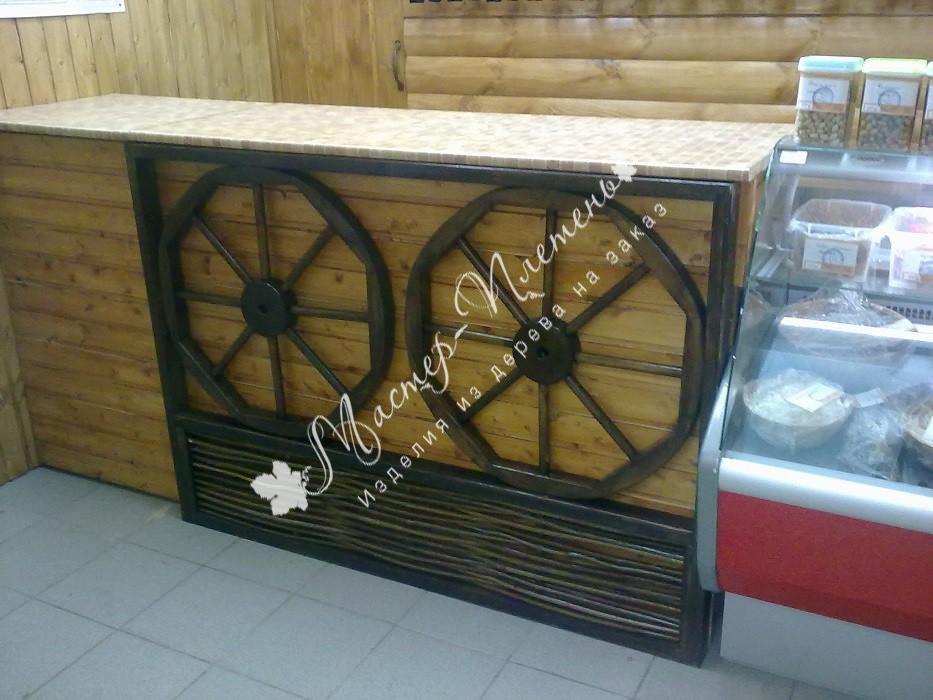 Выполнение заказов на нестандартные изделия из дерева - одна из особенностей нашей мастерской. В 2014 году нам была поставлена задача - оформить торговый павильон по эскизам заказчика, с который мы, пожалуй, блестяще справились! Прилавок украшен деревянными колесами и плетнем.