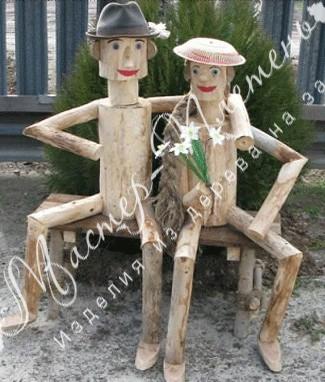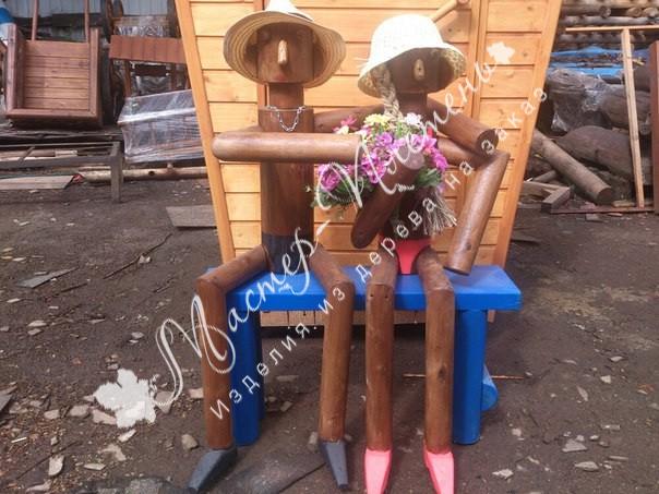 Веселая и забавная фигура пары - мужчины и девушки с косой выполнена из дерева, за исключением аксессуаров - шляпок и косы. Таких забавных жителей можно посадить на приусадебном участке в укромное место, они будут символизировать мир и покой дома.