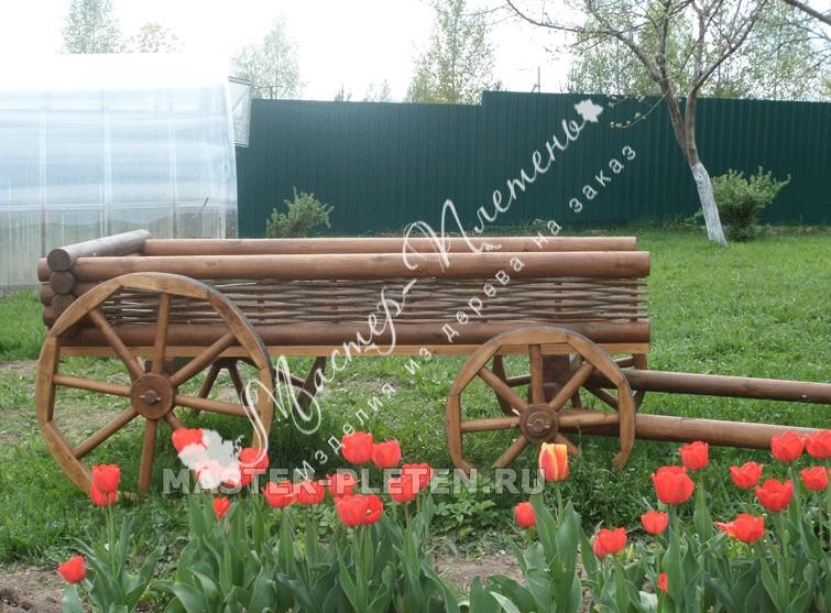 Данную телегу можно установить на участке около дома или в саду. Три стороны телеги закрыты высокими и прочными плетеными бортиками, способными выдерживать большие нагрузки, и это значительно расширяет возможности ее использования. Телега довольно вместительная. В ней можно разместить горшки с цветами или дачные аксессуары.