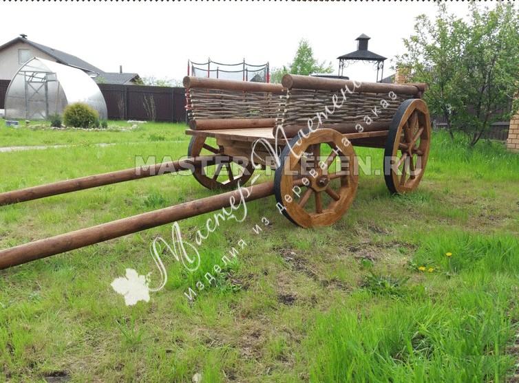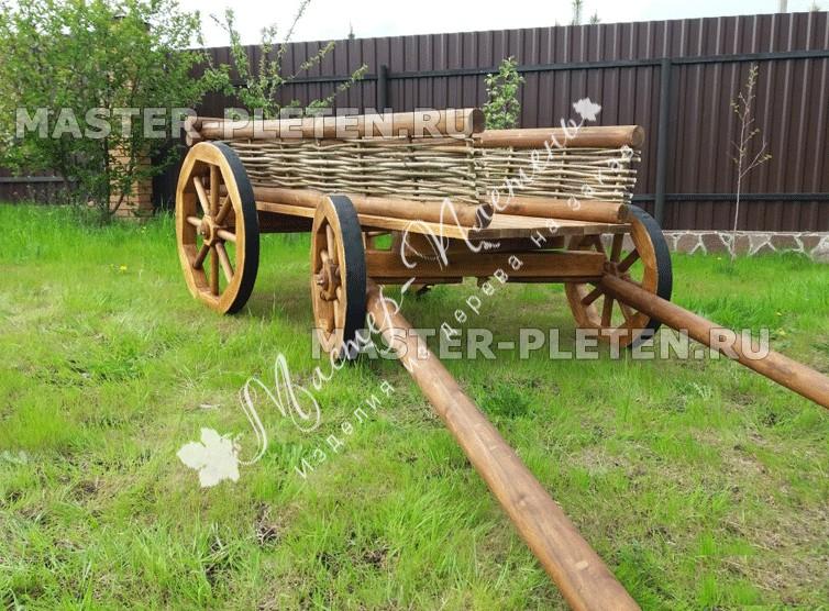 Телега декоративная с плетеными бортами украсит собой любой ландшафт. Она достаточно большая ее длина составляет 2 метра без длины оглобли, общая длина от конца оглобли до края телеги 3,9 метра. Для ее установки понадобиться достаточно просторное место.
