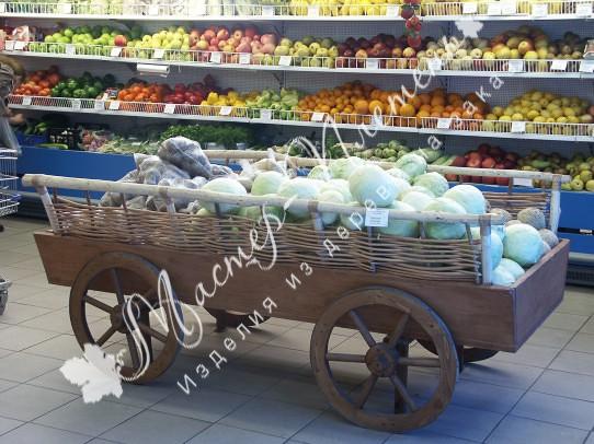 Телега из дерева с плетеными бортами станет отличной витриной или декоративным элементом в саду. Деревянная конструкция прочная и может выдержать достаточно большой вес, потому может быть использована для выкладки овощей и фруктов в довольно больших количествах, или же других товаров. Мимо такой необычной "витрины" не пройдет ни один покупатель.