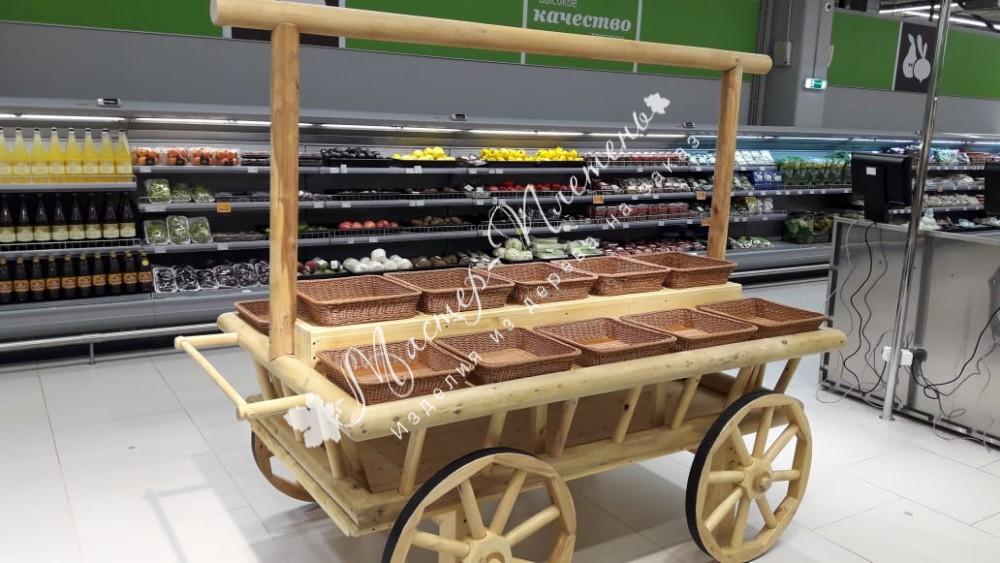 Телега витрина для размещения товаров имеет прочные борта, которые позволяют разместить достаточно большое количество разной продукции. разместить купленные отдельно плетеные ящики. Деревянная телега опирается на прочные 4 колеса, которые жестко фиксируются, чтобы витрина не двигалась с места. Сверху конструкция имеет дополнительную деревянную перекладину, чтобы на нее повесить рекламную вывеску, или же разместить дополнительные материалы и товары, которые будет видно издалека прохожим и покупателям.