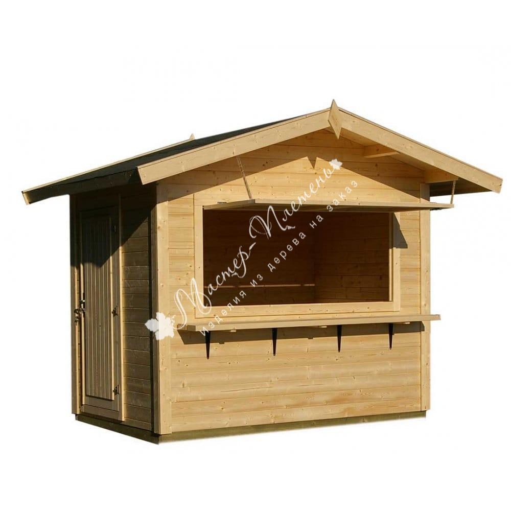 Деревянный ярмарочный домик сравнительно небольших размеров прекрасно подойдет для работы в сфере торговли, подходит для одиночного размещения или установки в торговом ряду. Конструкция киоска простая, выглядит он стильно, оригинально. Ярмарочный домик из светлого дерева оснащен одним большим окном, которое можно открывать и закрывать. Сбоку предусмотрена дверь, а снаружи закреплена полка, предназначенная для размещения товаров продавцом или покупателями при приобретении товара. Возможно визуальное оформление под индивидуальные особенности бренда торговой точки. Данную конструкцию ярмарочного домика можно установить стационарно или на передвижной платформе.