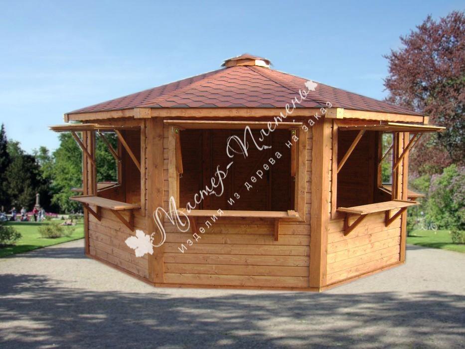 Ярмарочный домик в форме шатра выполнен из дерева. Используется с целью организации торговли, в том числе на таких мероприятиях, как ярмарки, фестивали. Сборка конструкции осуществляется непосредственно на территории проведения ярмарки, на месте организации торговой точки.