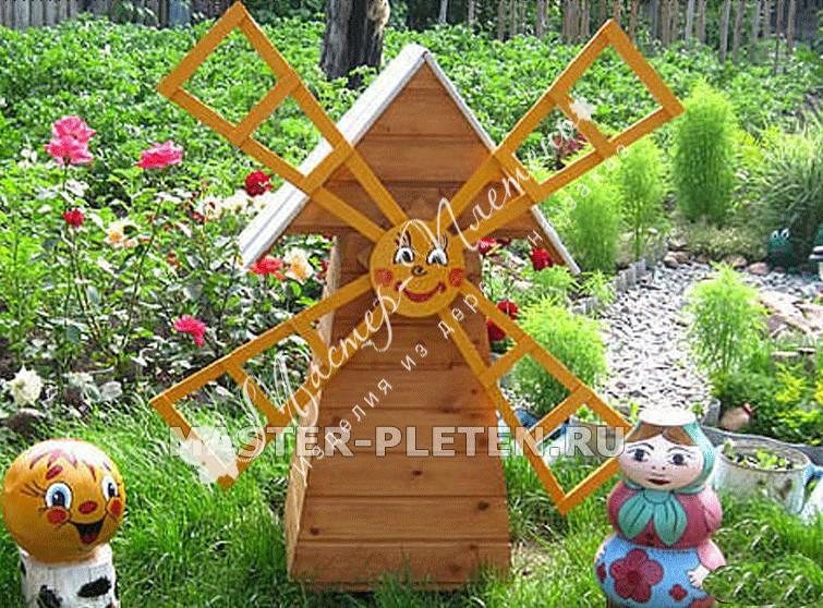 Забавная мельница из дерева с личиком может стать достоянием детского садика и любимым местом игр детворы. Такое изделие вызывает улыбку, оно создает атмосферу сказочного волшебства, где каждый предмет будто по-настоящему живой. Мельница не большая по высоте, ее лопасти подвижны.